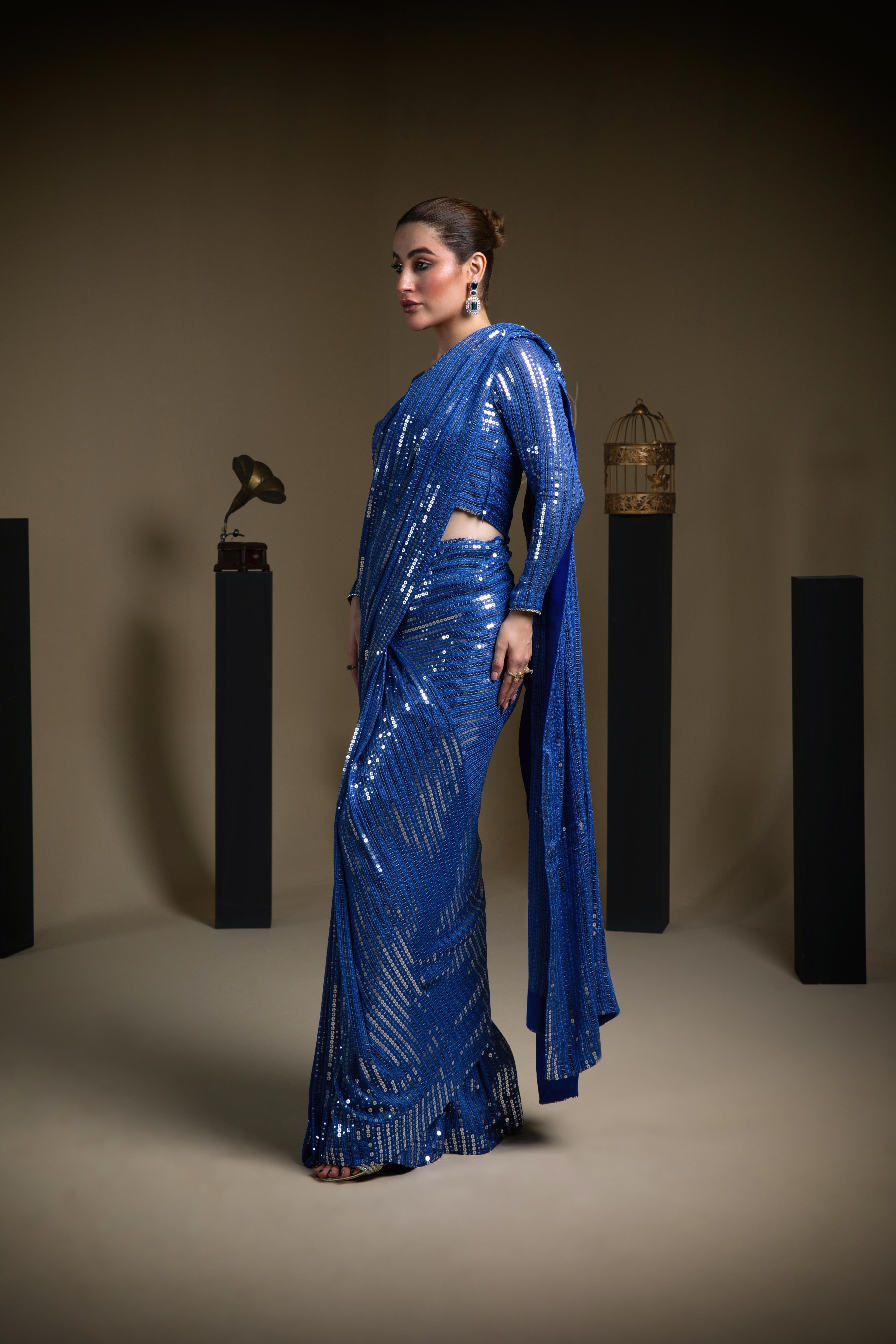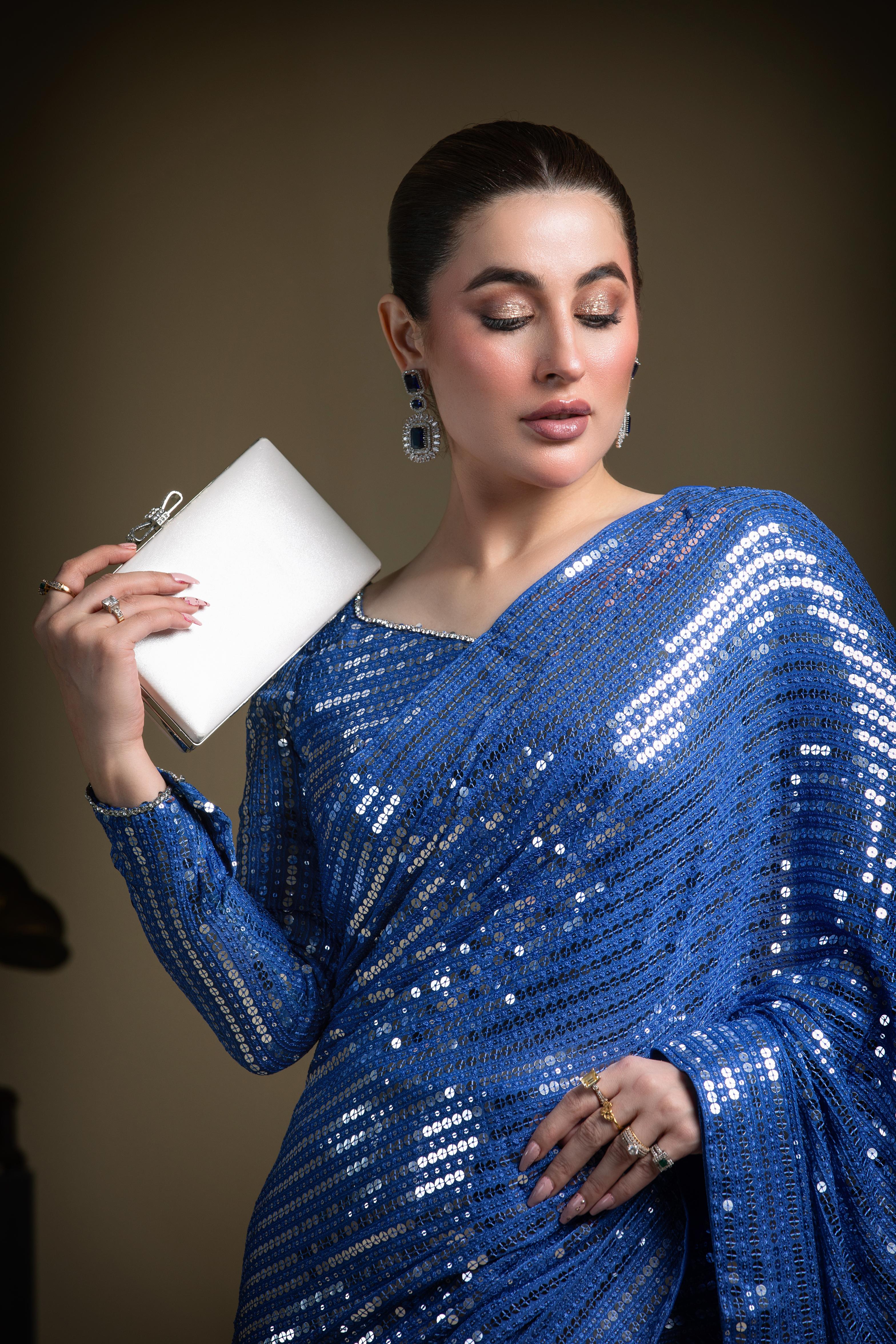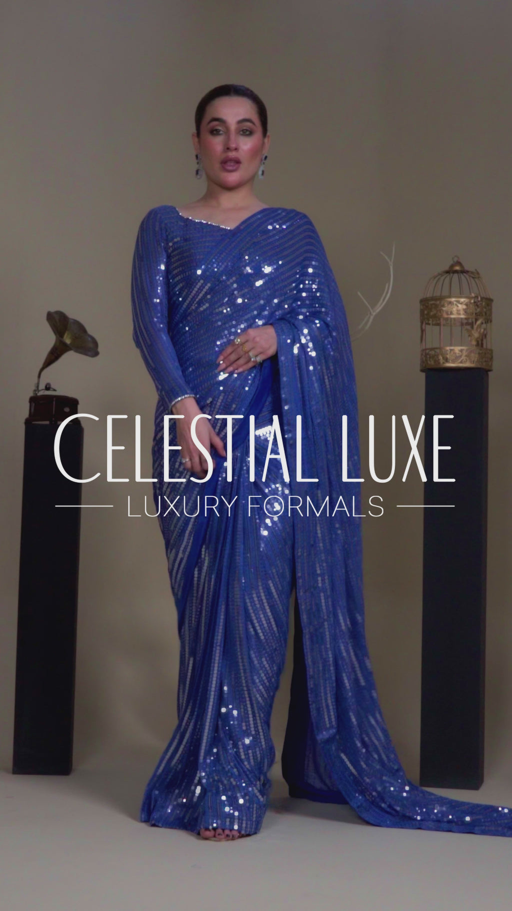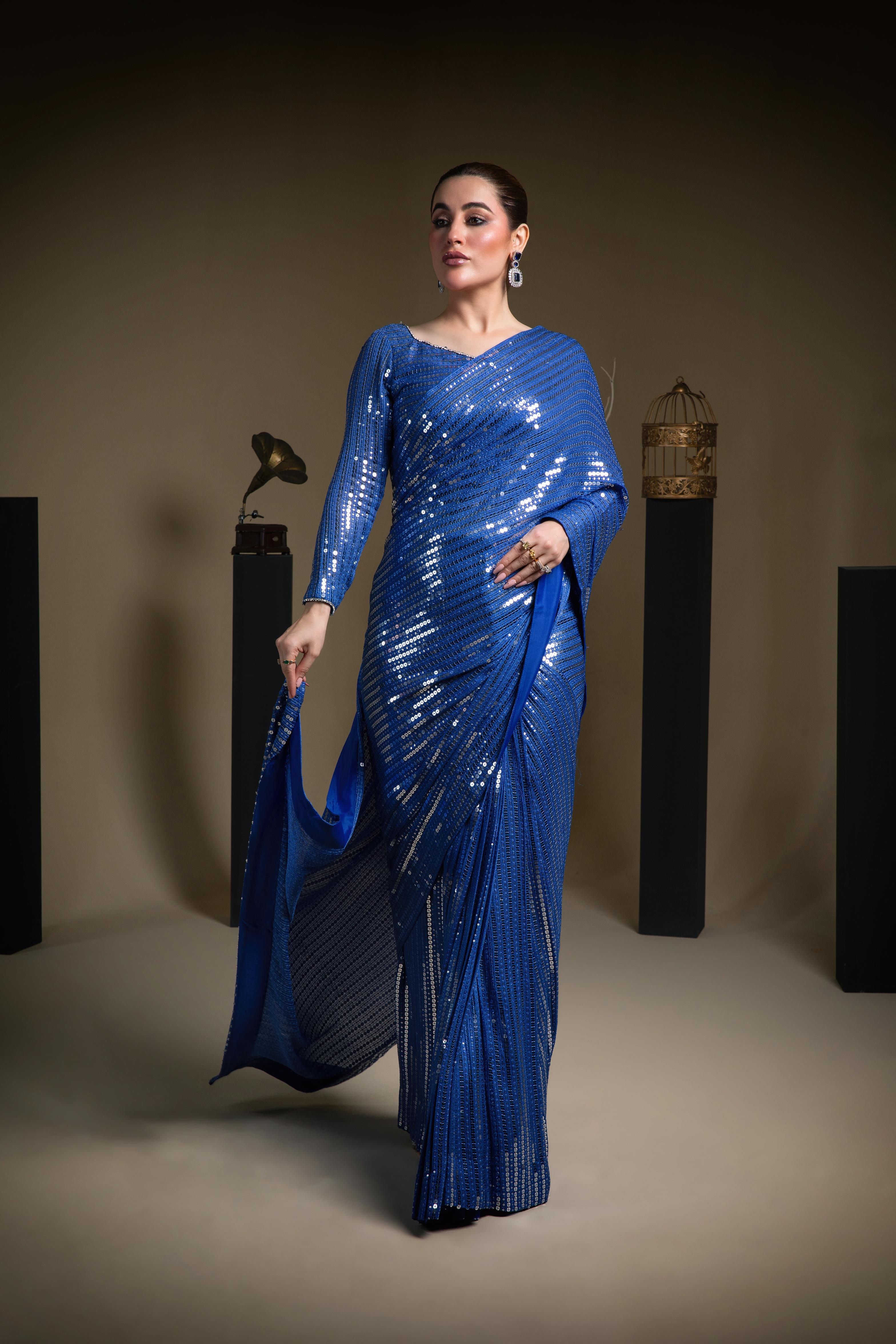 Mesmerizing Saree set which includes Blouse, Saree & petticoat. The saree drapes so elegantly and features delicate sitara & resham work all over the chiffon fabric. Neckline and sleeves embellished with alluring crystals.