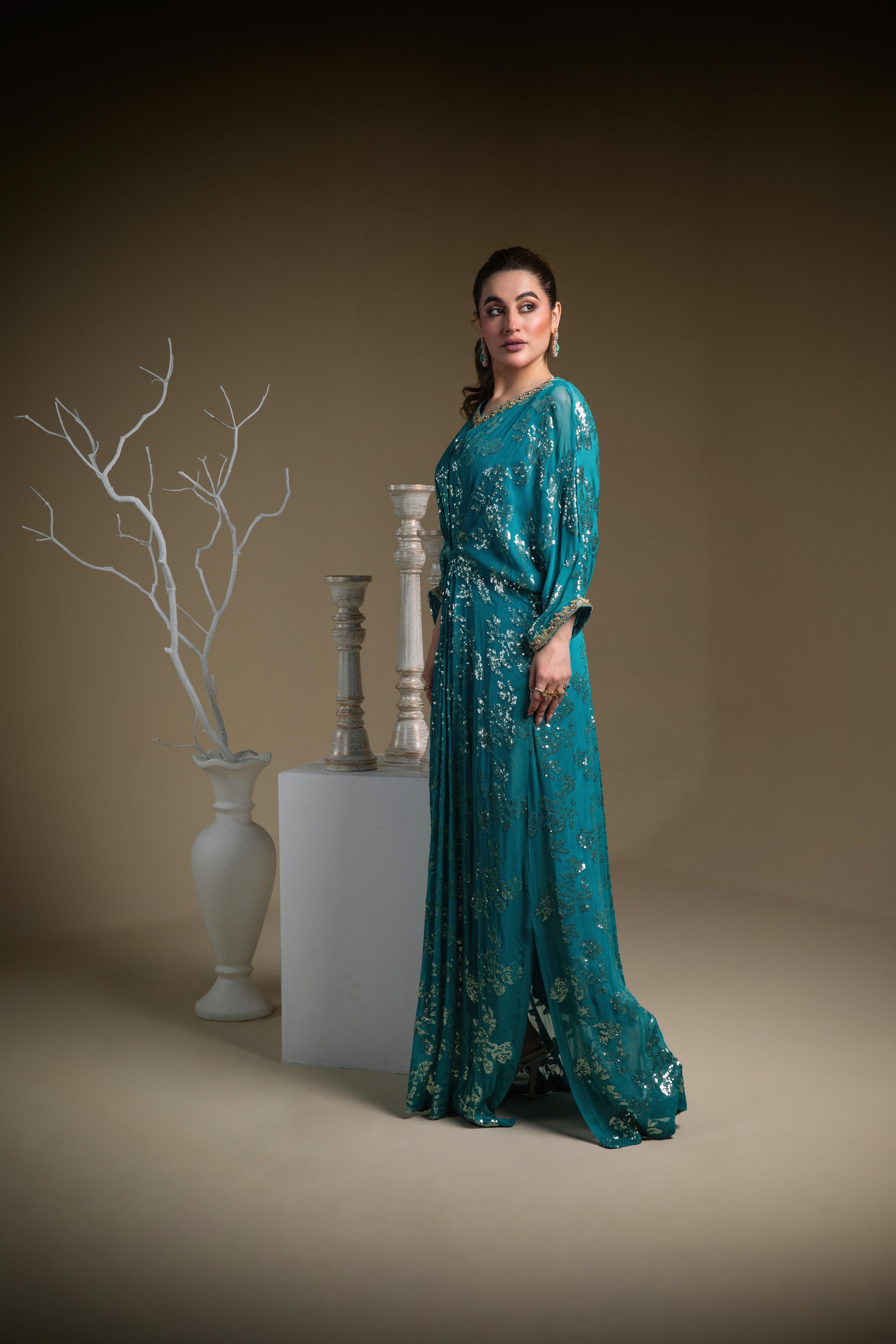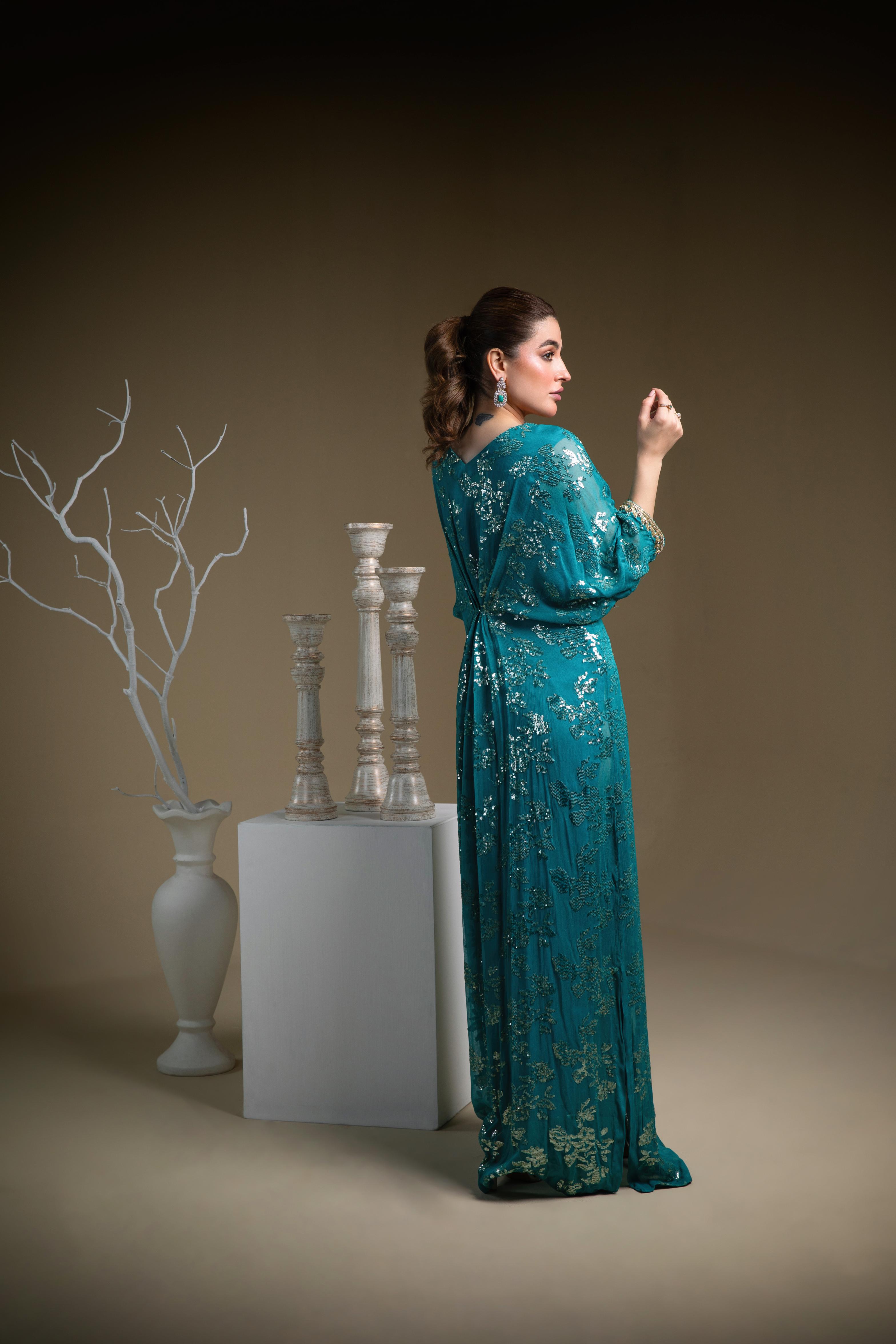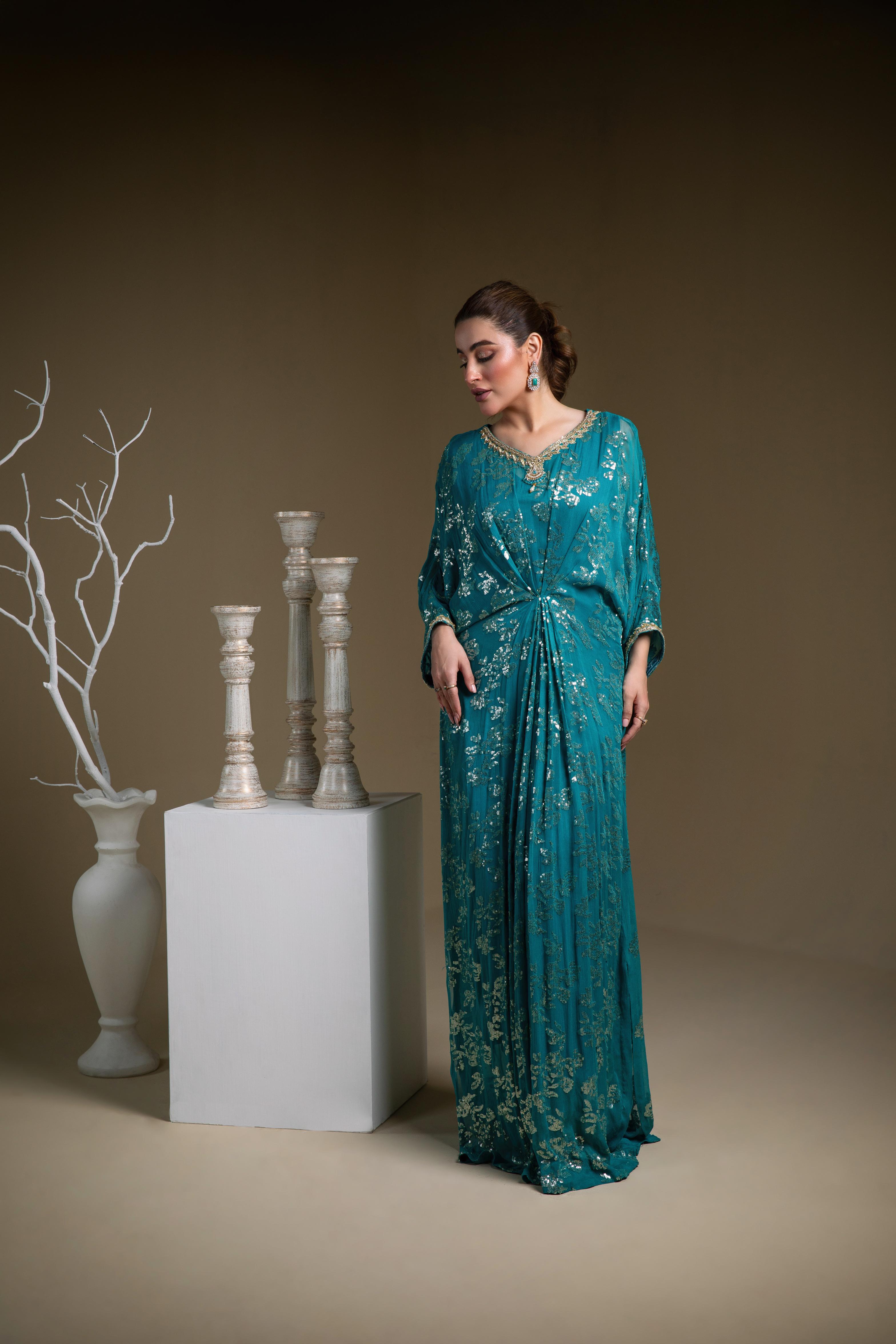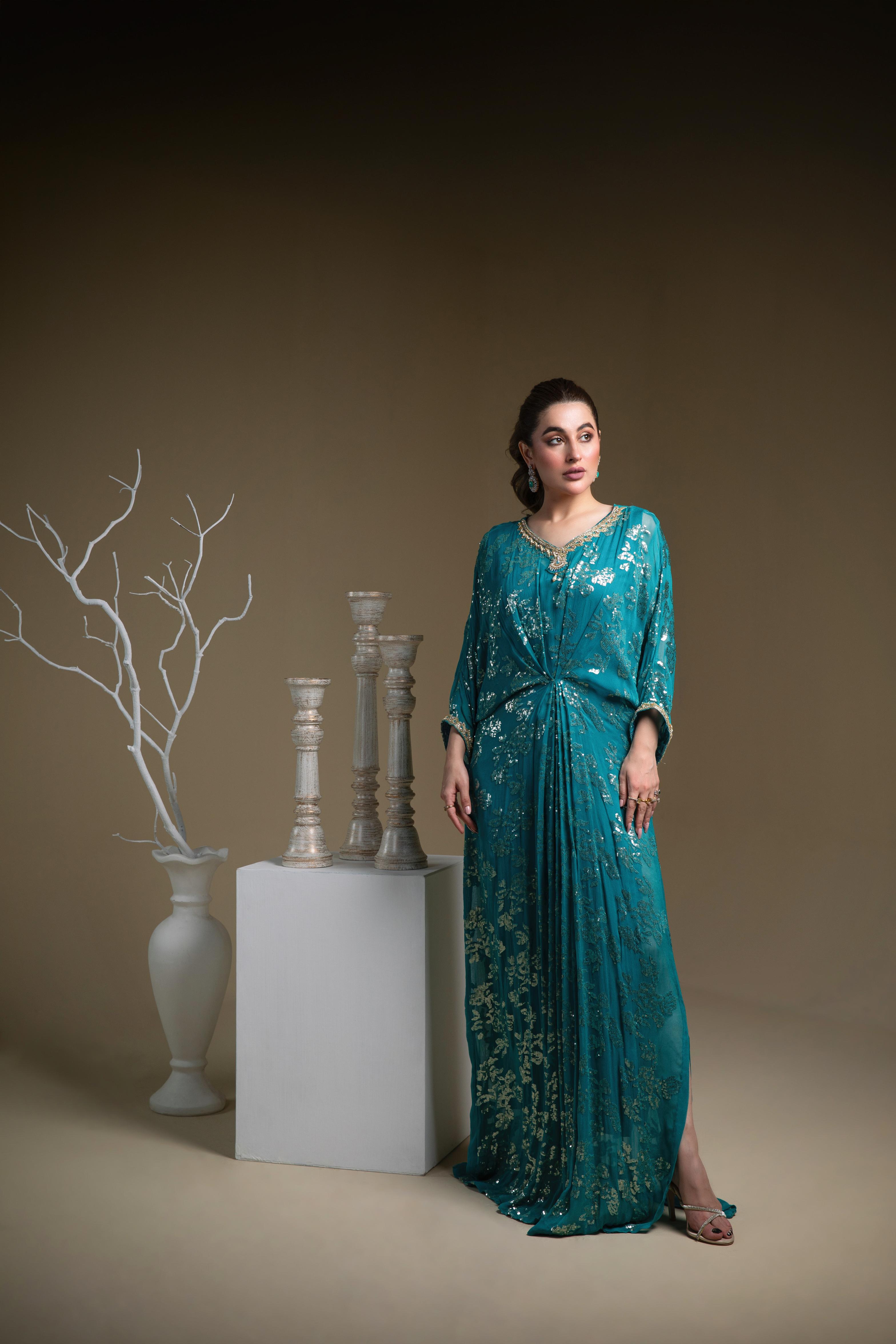 Indulge in a captivating blend of elegance & charm, add our Aqua Blue Kaaftan in your wardrobe.