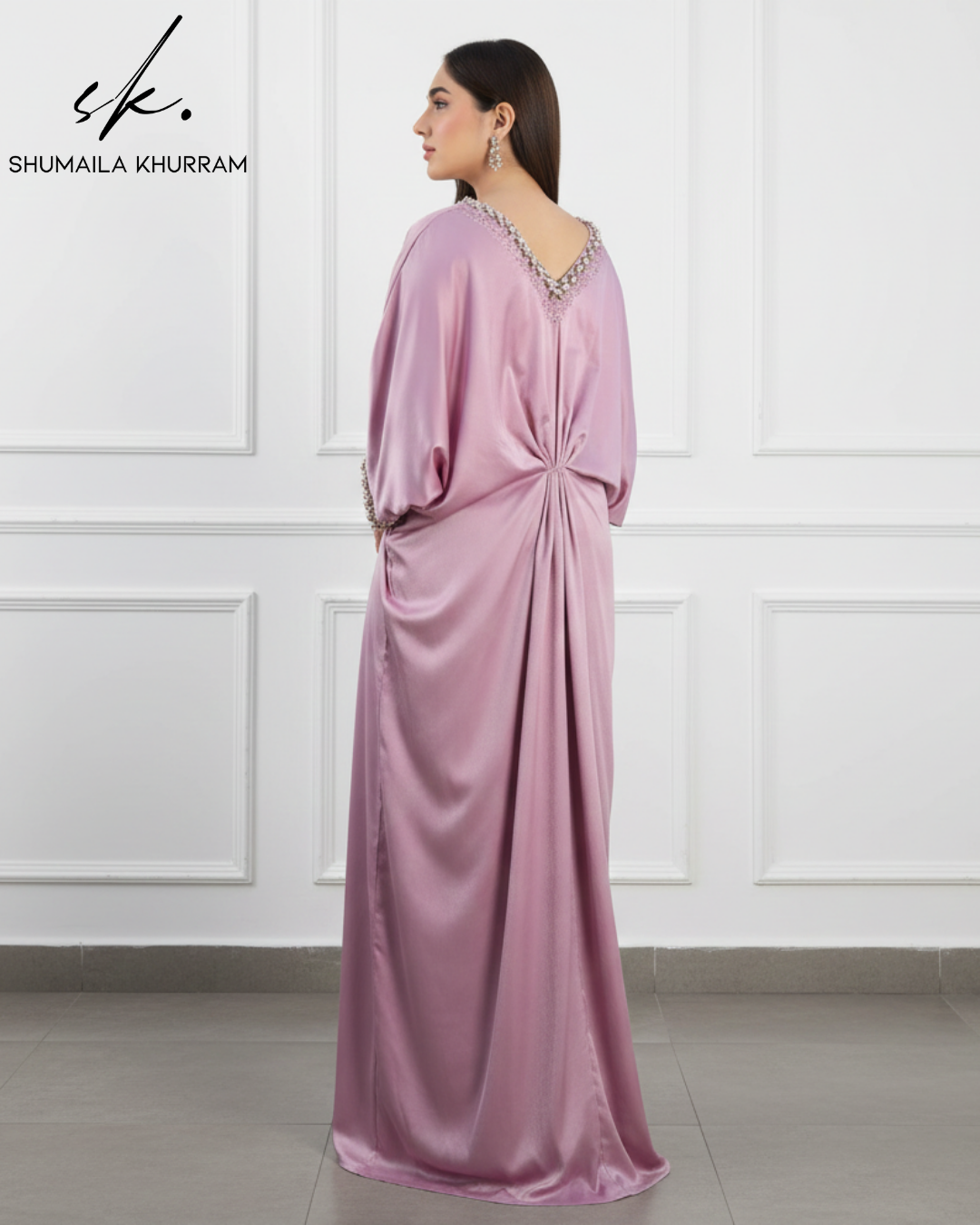 Designed with a flattering gathered waist and adorned with exquisite hand-embellished details on the neckline and cuffs, this silhouette offers the perfect blend of comfort and high fashion. The draped fit ensures effortless grace for any formal occasion