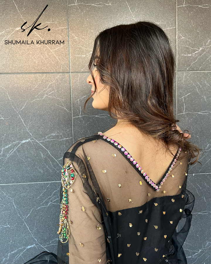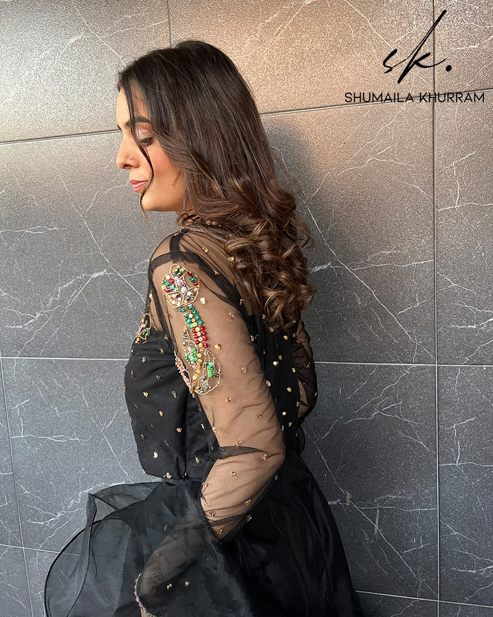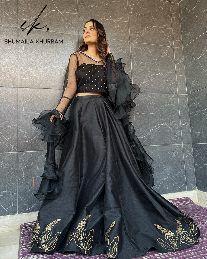 Exudes glow & festivity in masterpiece (Black Coral) by Shumaila Khurram. An elegant rhyme to tradition, absolute alluring amalgamation of Skirt, Blouse & Rufflecreating magic with its eye catching hues of Black & delicate style. Paired with mesmerizing Blouse heavily embellished by finest pearls, stones, sitara and crystals, absolutely compliment the attire. This extensive Flare (6-Yards) Skirt adorned by iridescent motifs of Block Print make for an enchanting display of grandeur