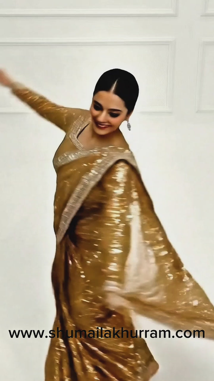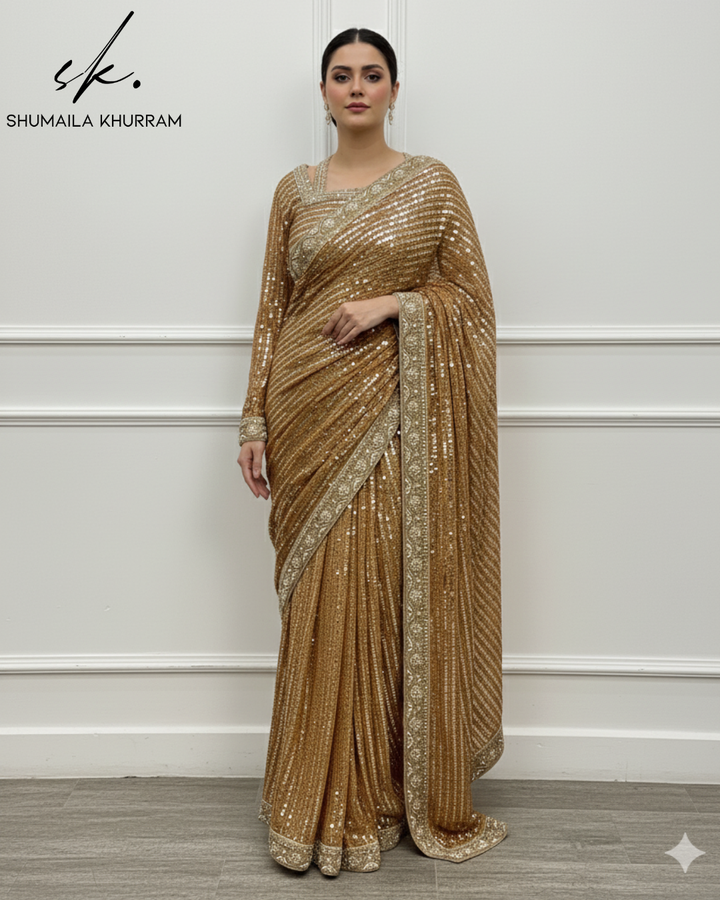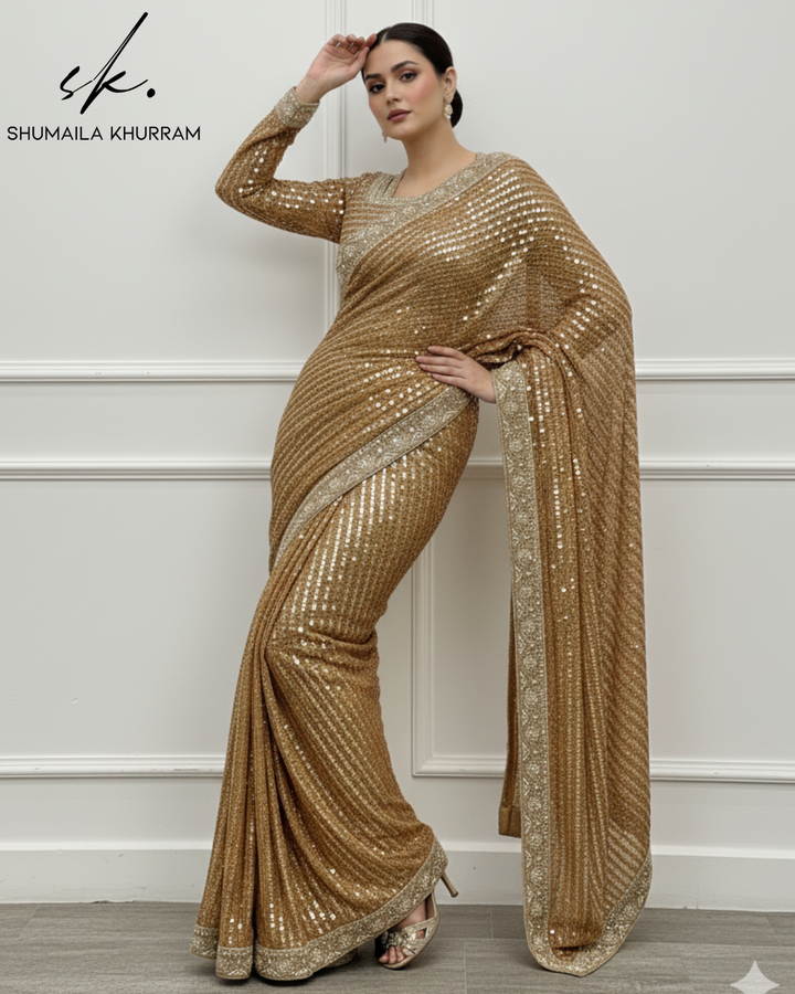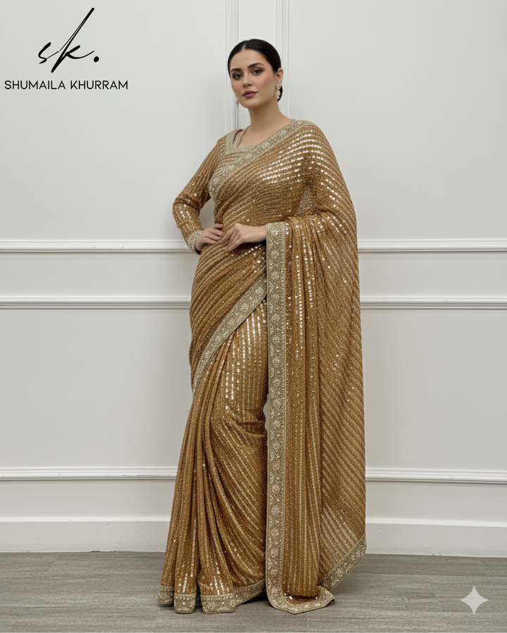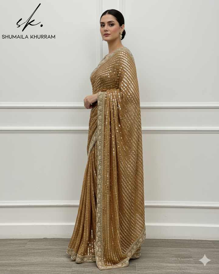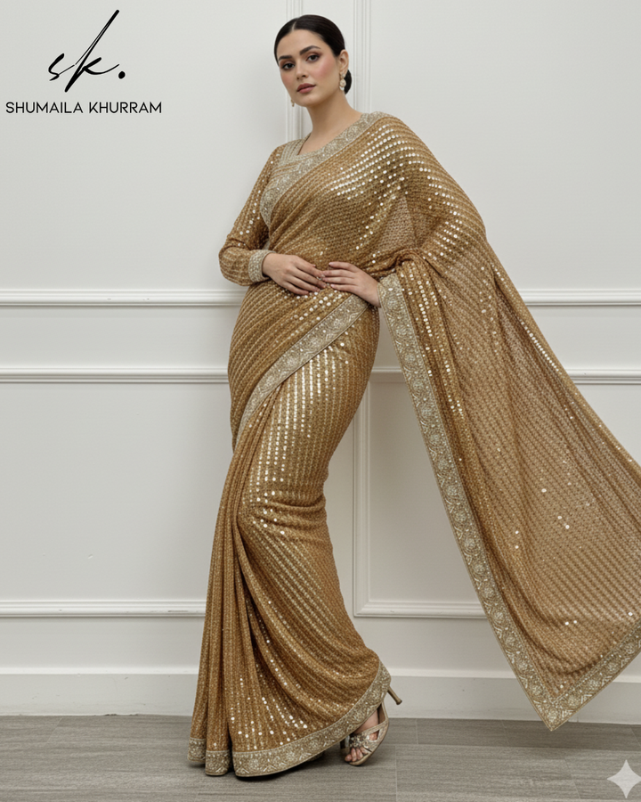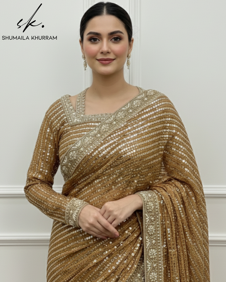 Confidence cloaked in gold. Introducing the Celeste Gold sareeâa perfect blend of traditional splendor and modern elegance. Notice the finely detailed neckline and the mesmerizing drape, designed to enhance every curve. True style is in the details, and this piece is pure poetry.