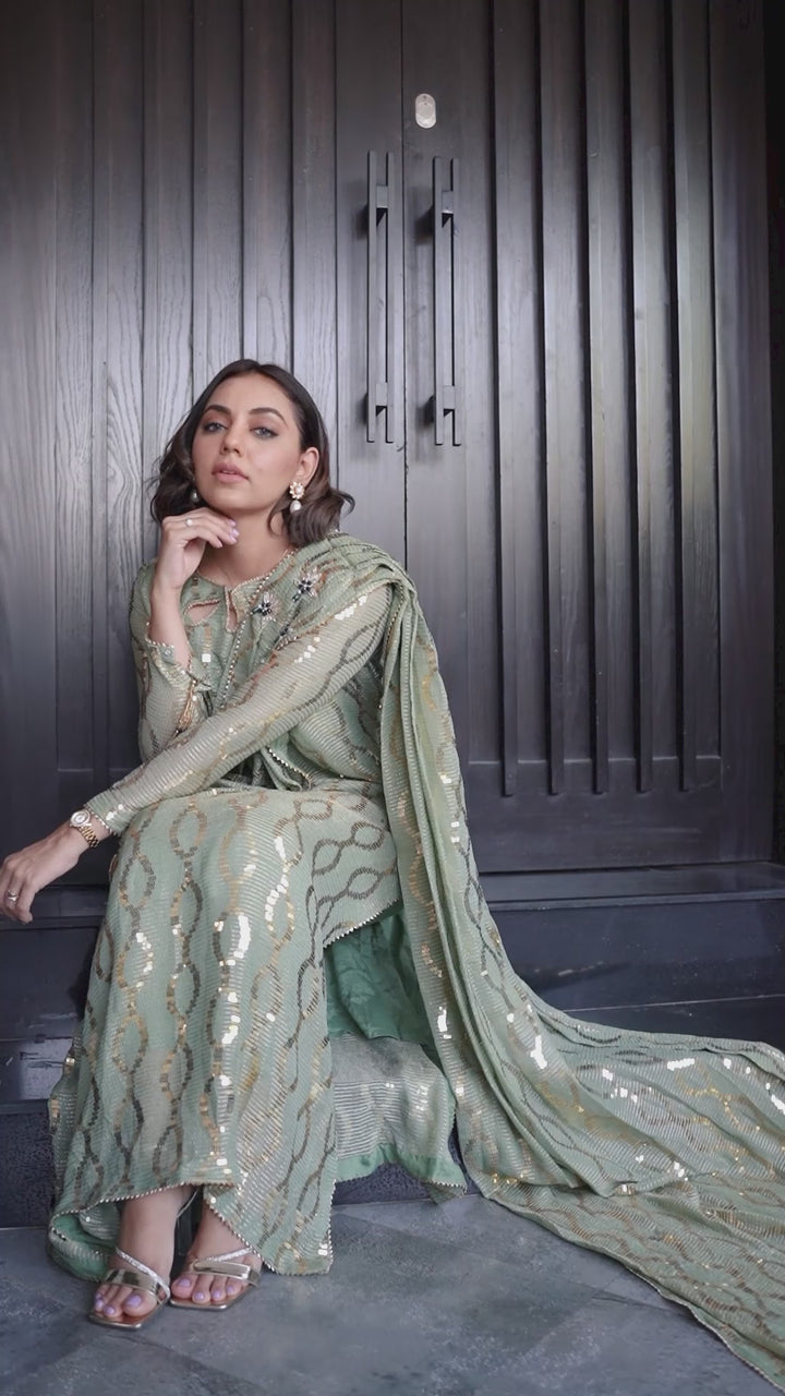 A Dreamy Sage Green PERIDOT ( Pre-Draped Saree ) crafted by love & all over sitara & resham sequin.
