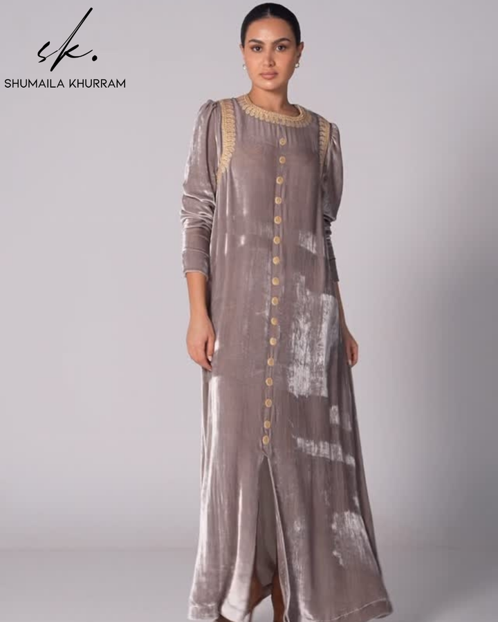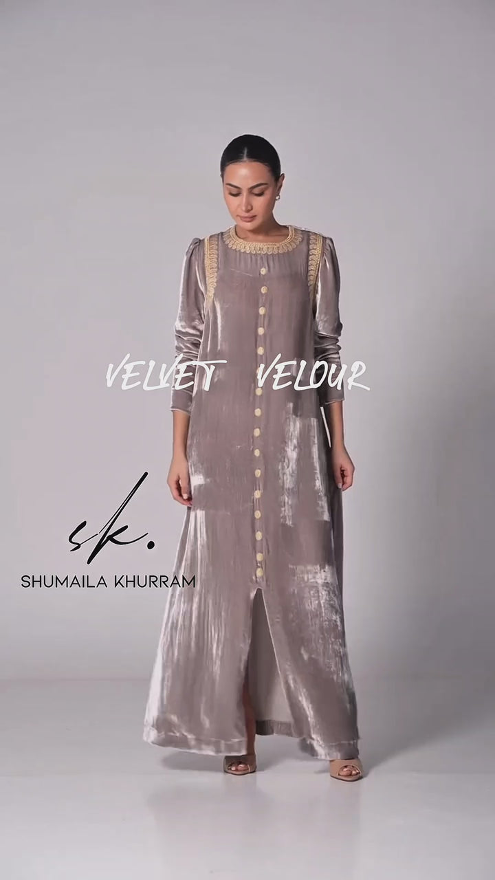 Crafted from sumptuous dusty grey velvet, this floor-length & front open kaftan exudes sophisticated charm. The design is elevated by exquisite, lace detailing that adorns the high neckline and long sleeves, adding a touch of understated glamour.